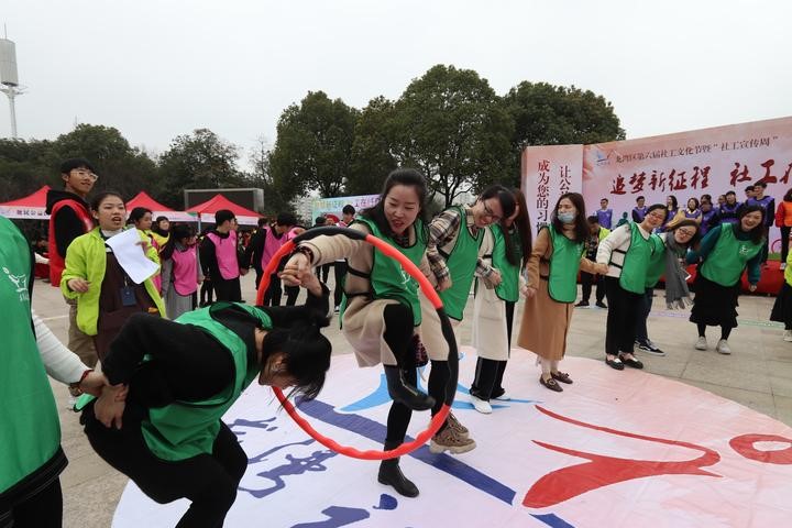 人员:抽取20个人员参加,分为4组,组员高矮胖瘦随机。道具:呼拉圈2个游戏规则:采取淘汰赛制。两队两队比。同组队员手拉手,不能松手,让呼拉圈从最右侧的队员右手开始,靠身体蠕动将呼拉圈传递到最左侧队员的左手。中途不松手,时间最短的代表队获胜。